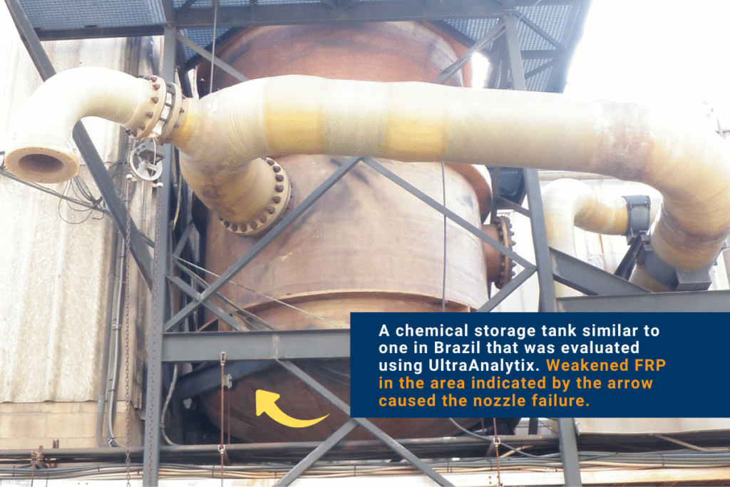 An engineer at a chemical production facility in Brazil reached out to UTComp to help investigate the damage to a storage tank that had failed. Experts on site were focusing on a nozzle, convinced that the failure was due to a manufacturing defect or poor nozzle installation.